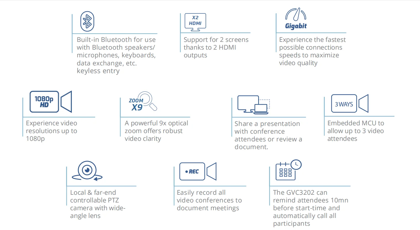 The GVC3202 is a ground-breaking solution that offers businesses a revolutionary video conferencing system with unprecedented flexibility and the power of support for multiple popular video conferencing protocols and platforms right out of the box. The SIP-based GVC3202 supports Grandstream’s robust IPVideoTalk platform for plug and play video conferencing while also being interoperable with any 3rd party SIP video conferencing platform - thus offering a great option to expand or implement a 3rd party platform. In comparison to Grandstream’s GVC3200, the GVC3202 offers a slightly lower capacity option for businesses looking for up to 3-way video-conferencing and support for up to 2 Full HD monitors. The GVC3202 sports an innovative, patent-pending embedded MCU that supports up to 3-way conferencing with local mixing between SIP and other protocols.