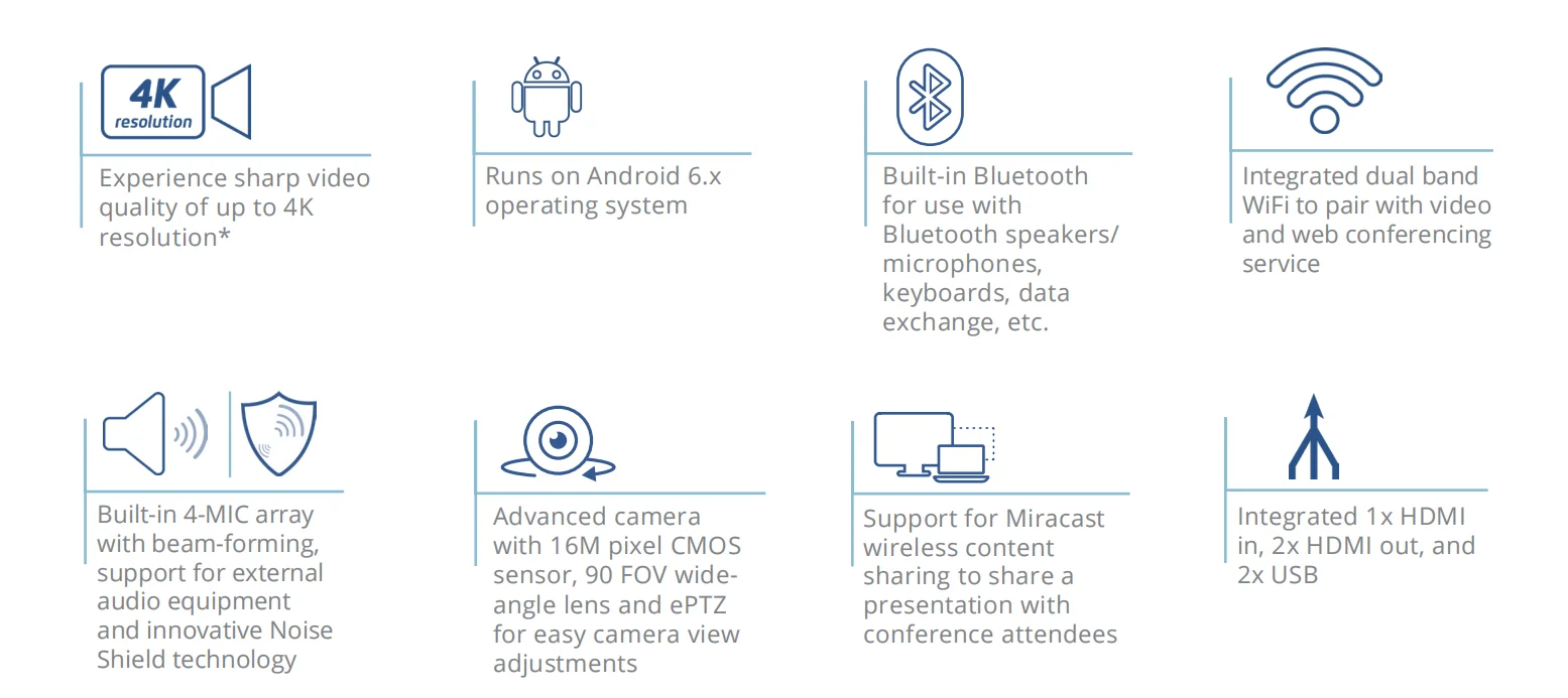 The GVC3210 is an innovative video conferencing endpoint ideal for small to medium businesses who seek an easy-to-use yet potent video conferencing solution. By supporting top-tier video resolutions up to 4K Ultra HD, the GVC3210 turns any video conference into a powerful, clear, enhancing experience. Designed to allow users to customize their solution according to their specific communication needs, the GVC3210 can be paired with most video and web conferencing services to create a multi-point conferencing system. This video conferencing endpoint runs on the AndroidTM operating system. This allows users to utilize any Android conferencing or communication application. The GVC3210 comes equipped with sophisticated Noise-Shield technology to block out background noise and maximize audio quality. Additional features include advanced 4-microphone array with beam-forming capability, a high-end 16M pixel CMOS sensor with ePTZ for easy camera view adjustments and Miracast wireless for convenient content sharing. This simple yet powerful video conferencing endpoint is the ideal choice for SMBs looking for a price-friendly option that still carries the high-end features needed to sustain high-quality business communications.