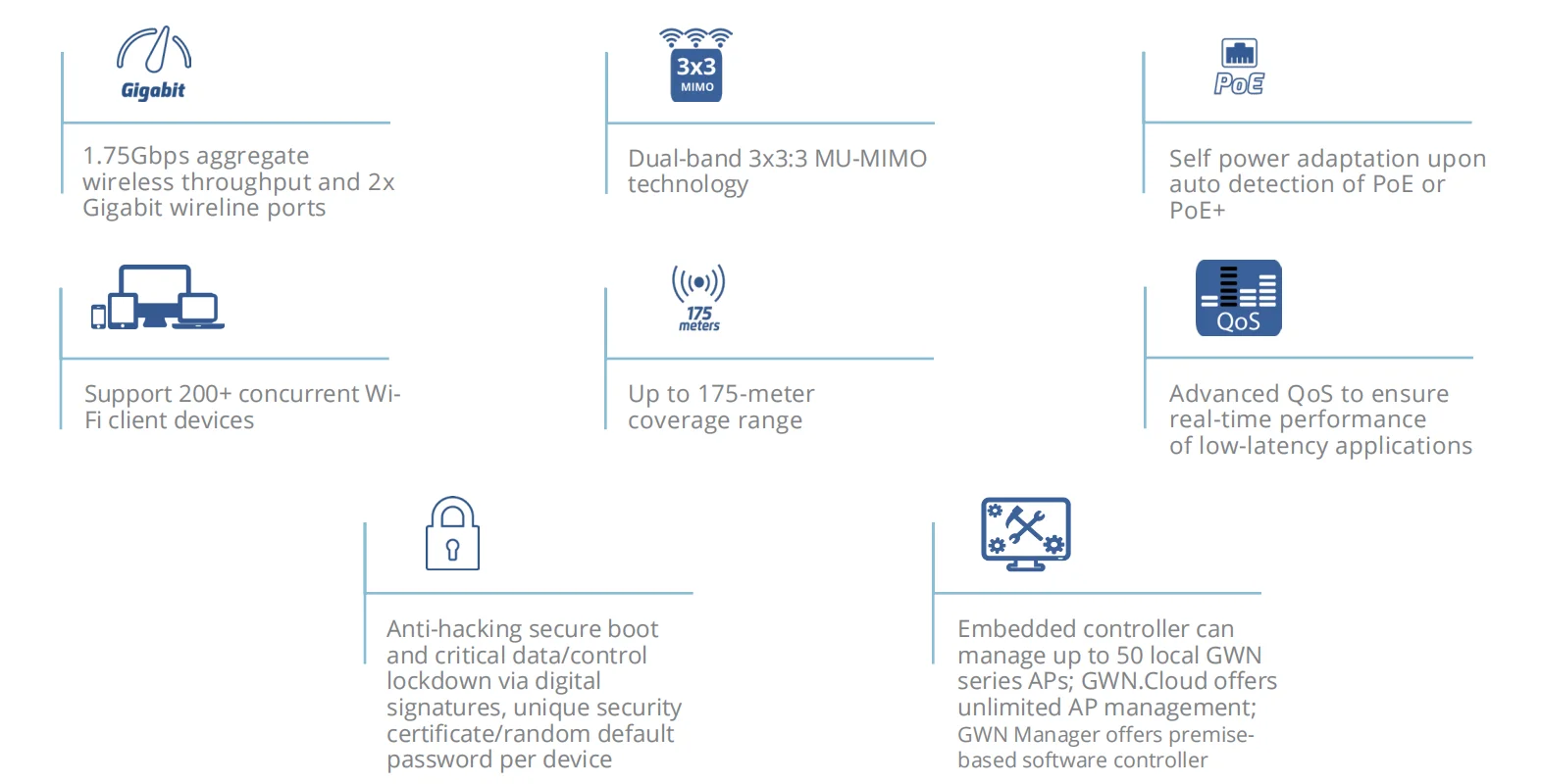| Network Management | Embedded controller can manage up to 50 local GWN APs GWN.Cloud offers a free cloud management platform for unlimited GWN APs GWN Manager offers premise-based software controller for up to 3,000 GWN APs |
