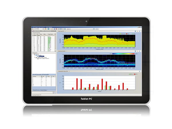 Spectrogram: The wireless spectrum analyzer displays a rolling history of the RF environment, allowing visual understanding of changes in the wireless spectrum over time and observation of intermittent peak RF energy that may cause wireless network issues.