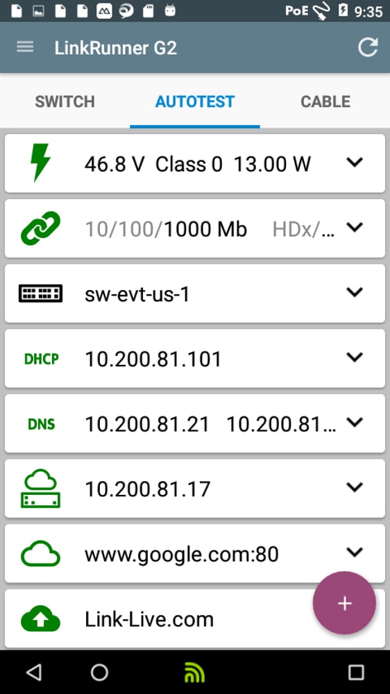 LinkRunner G2 is the first field tester able to validate loaded PoE performance by drawing actual power up to 802.3bt 90W across all four pairs. The device loads the circuit to stress switches, cabling, and patch panels, all while measuring the voltage and pairs being used. LinkRunner G2 uses the TruePower™ test to validate the power delivery before installing IoT connected devices to ensure a smooth deployment.