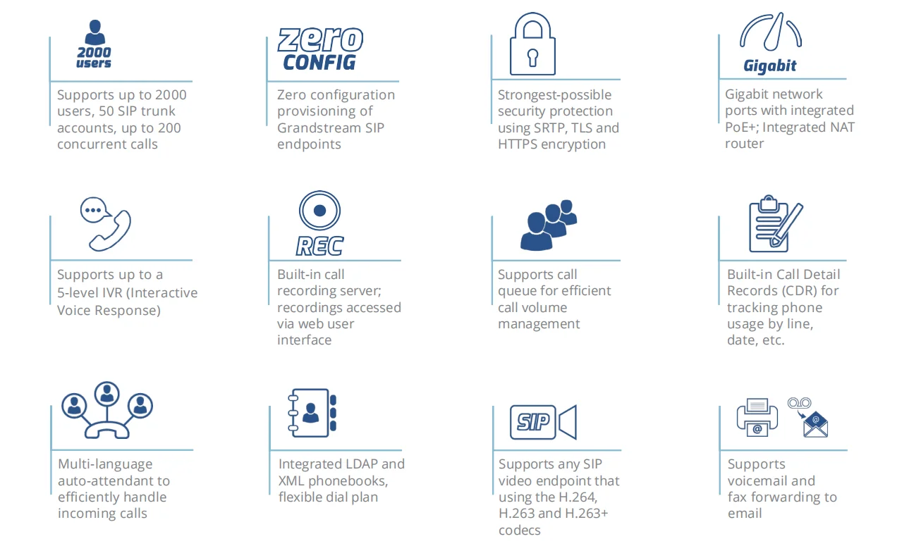 Maximum Call Capacity | Up to 2000 registered SIP endpoints, up to 200 concurrent calls |